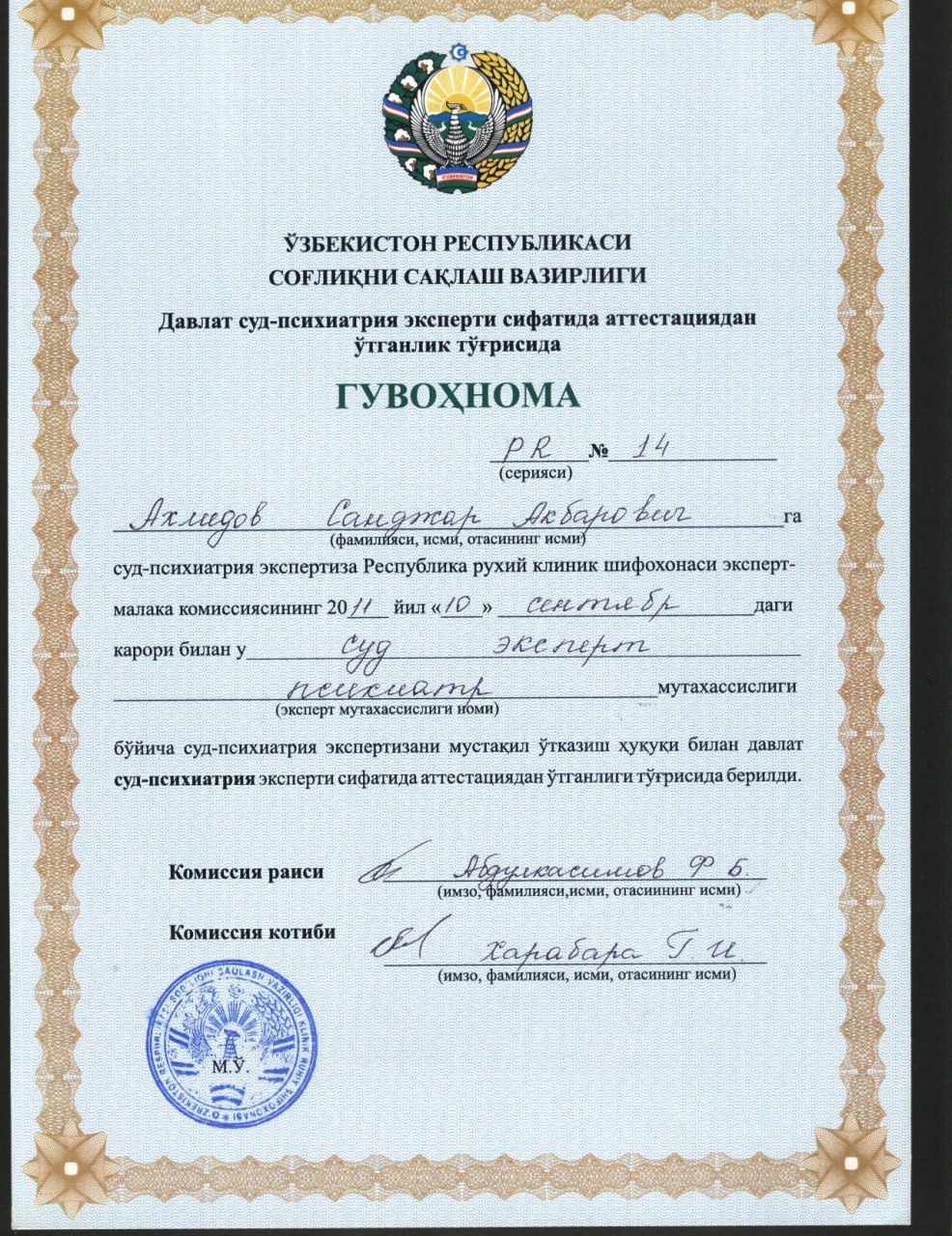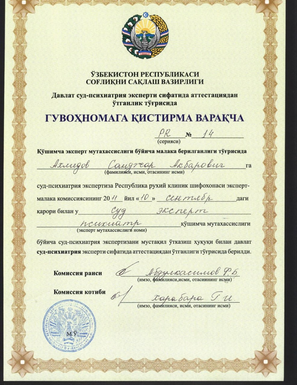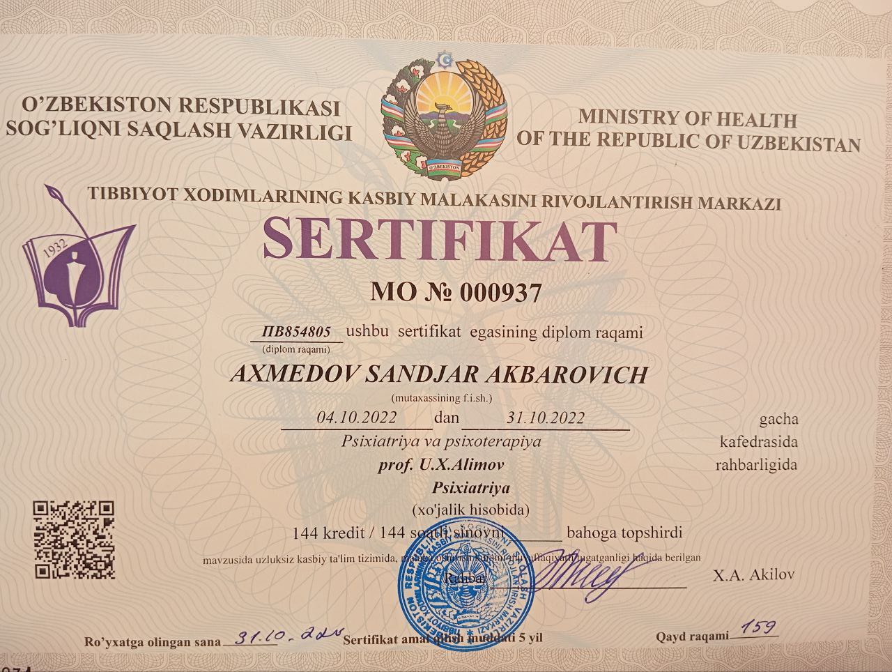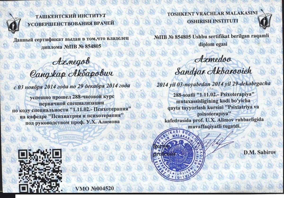 - 2014Ташкентский Институт Усовершенствования врачей, специализация, психотерапия
