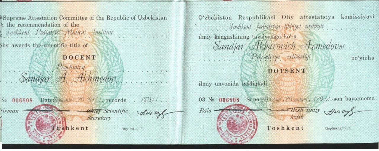 - 2015 - 2025Работал Доцент кафедры психиатрии и психотерапии в компании "ТашИУВ"