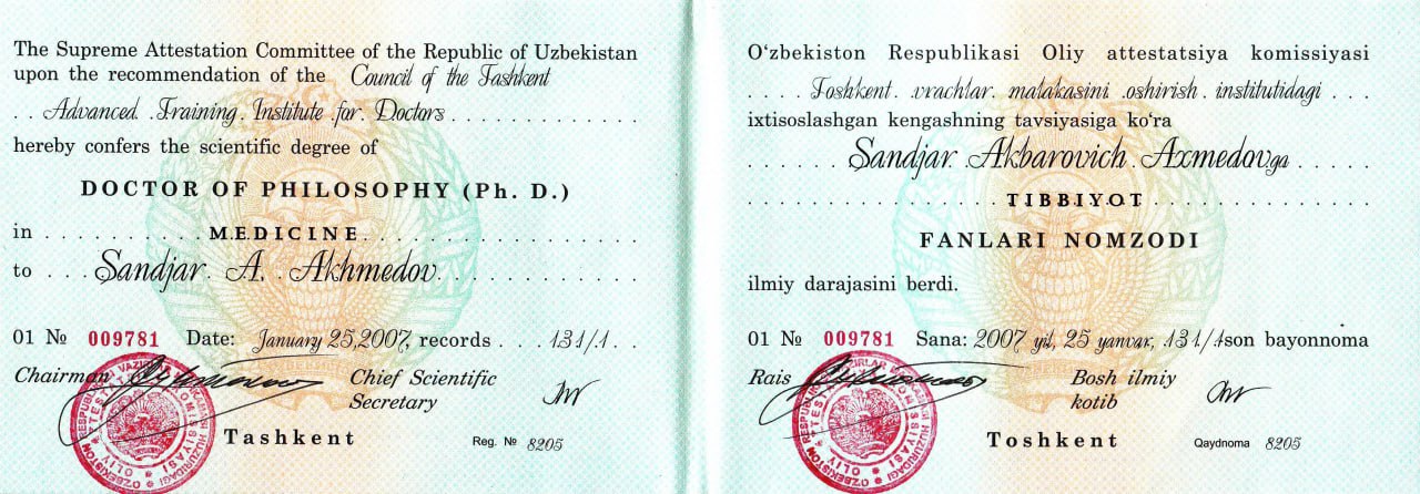 - 2006 Ташкентский Институт Усовершенствования врачей, кандидат медицинских наук.